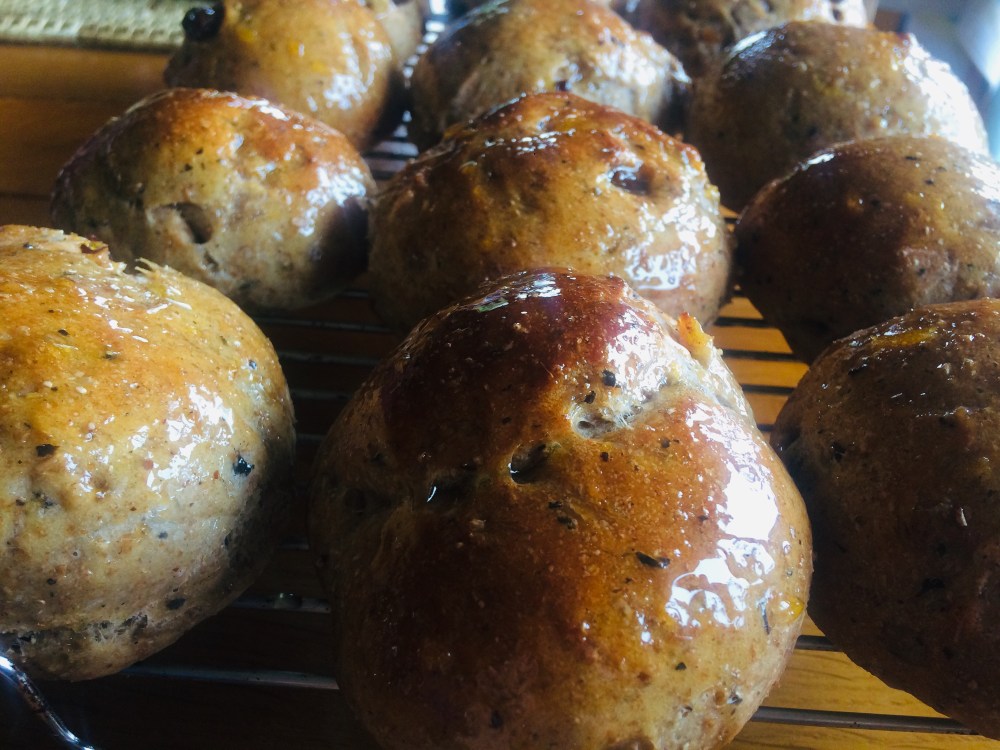 Lightly sprinkle your buns with water and bake at 200°C for about 20 mins, until golden brown. While they’re still warm, brush the tops with marmalade and serve straight away! Once cooled, you can store these in an air-tight bag and keep for later. They’re delicious toasted too.