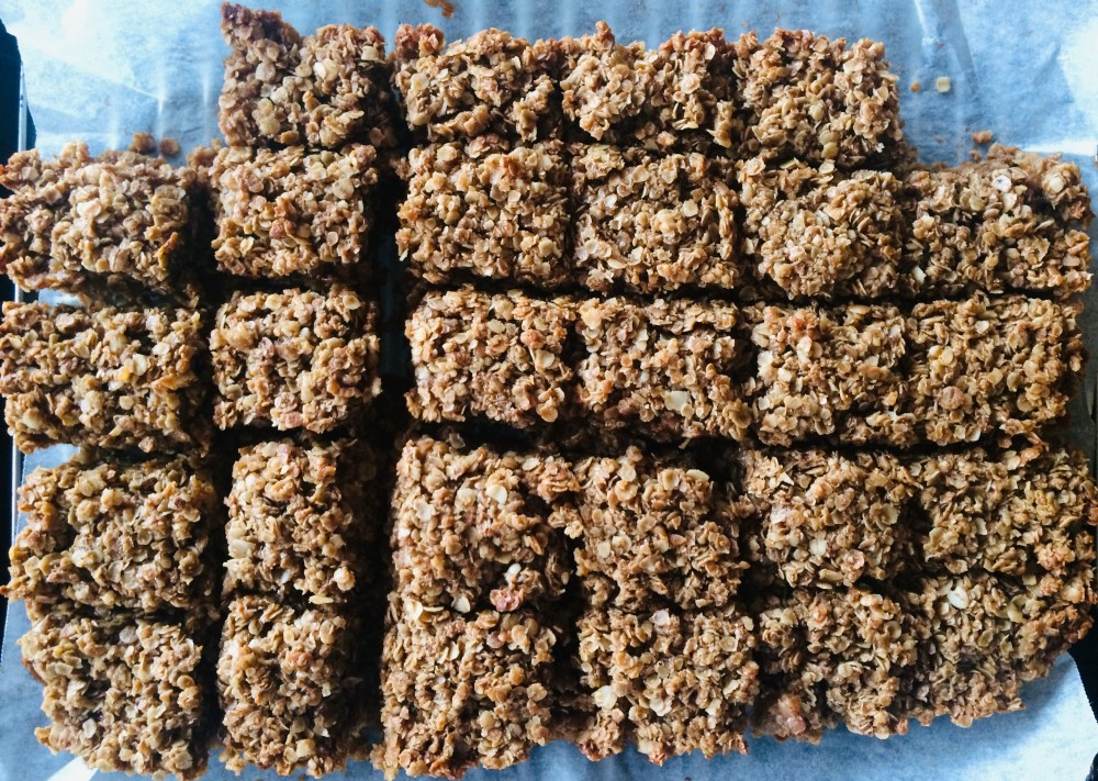 Ingredients: 350g rolled oats; 175g plant butter; 150g dark brown sugar; 100g golden syrup; 2 apples (Bramleys are best); 1 tsp mixed spice; 2 tbsp caster sugar; 1/2 tsp salt. Optional: handful of dried fruit.